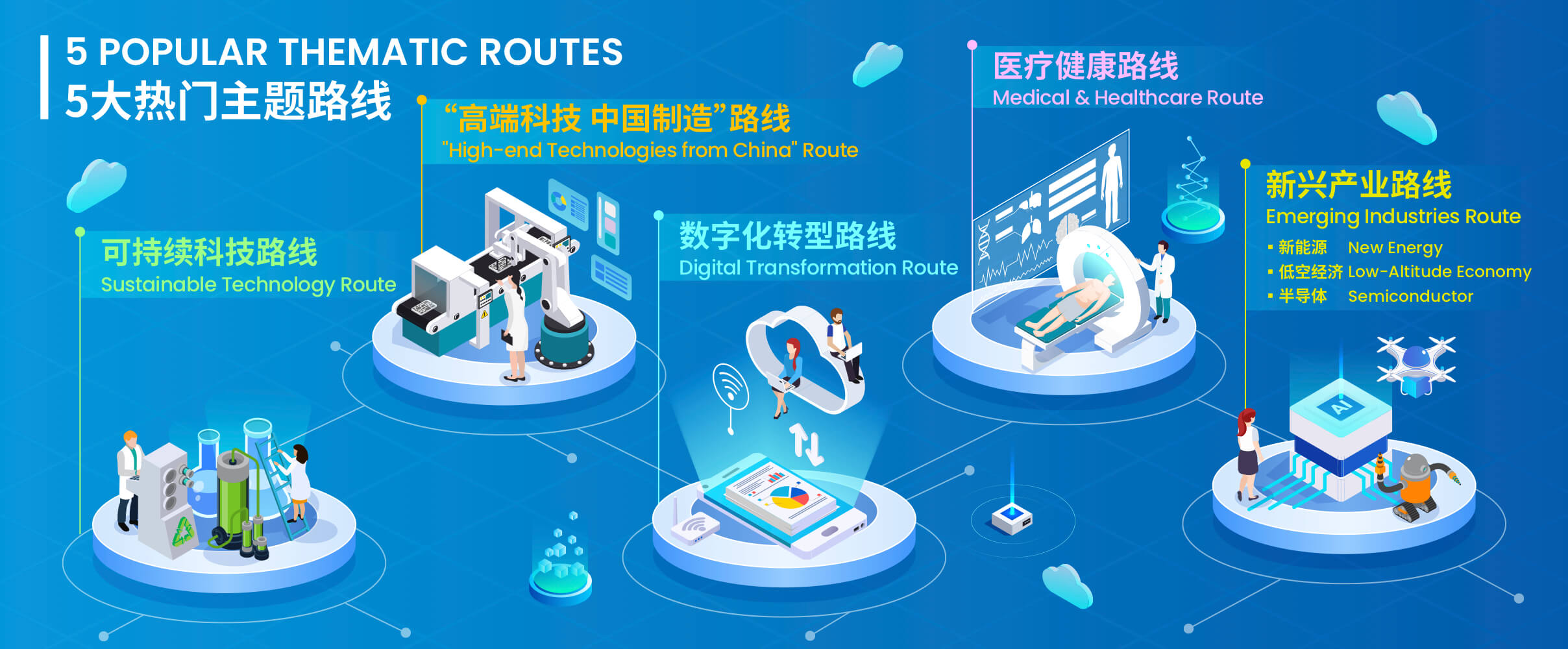 Based on the latest market hot topics about sustainable technology, "High-end Technologies from China", digital transformation, medical & healthcare and emerging industries, 5 visiting routes are designed to cover focal technologies and concurrent events, creating a pleasant and fruitful visiting experience for all.