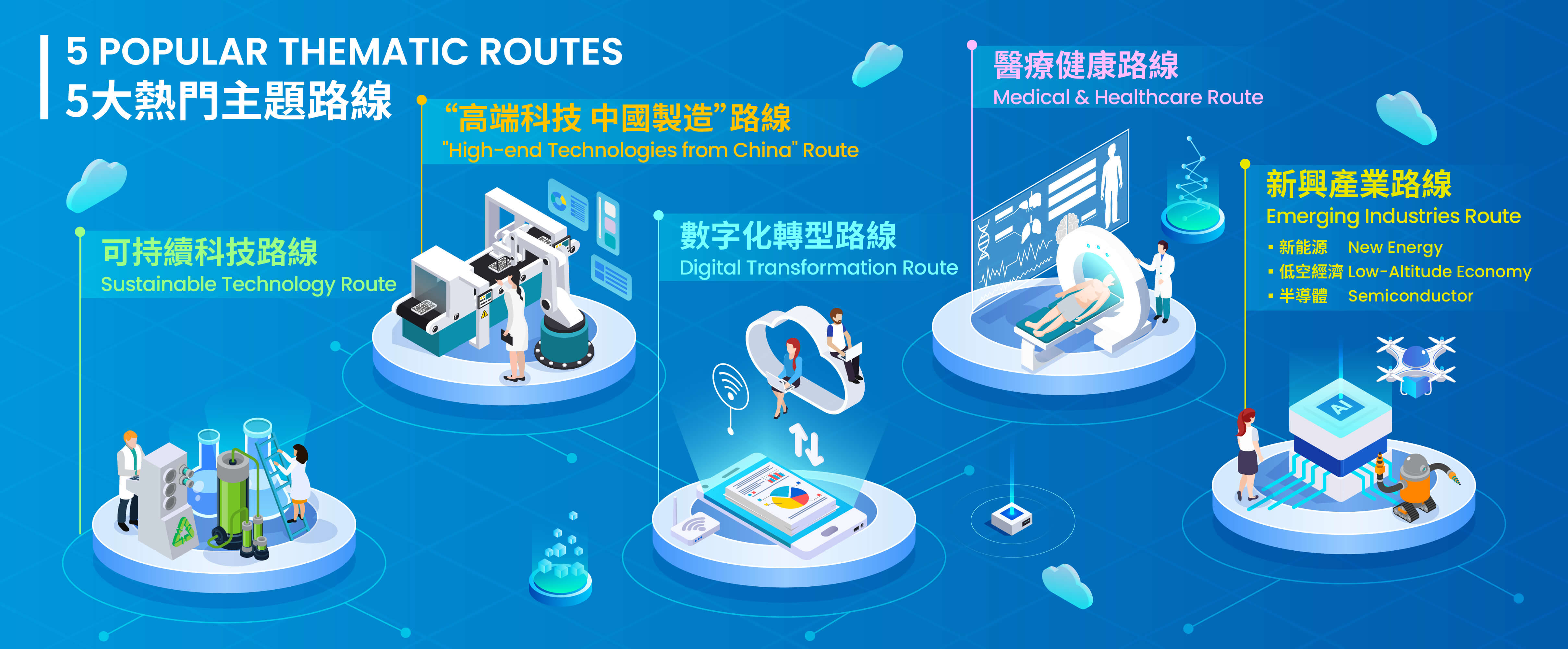 圍繞市場上最熱門的可持續科技、“高端科技 中國製造”、數字化轉型、醫療健康、新興產業等話題,把展會的焦點科技及精彩活動串連成為五條導賞路線,提升觀展體驗。